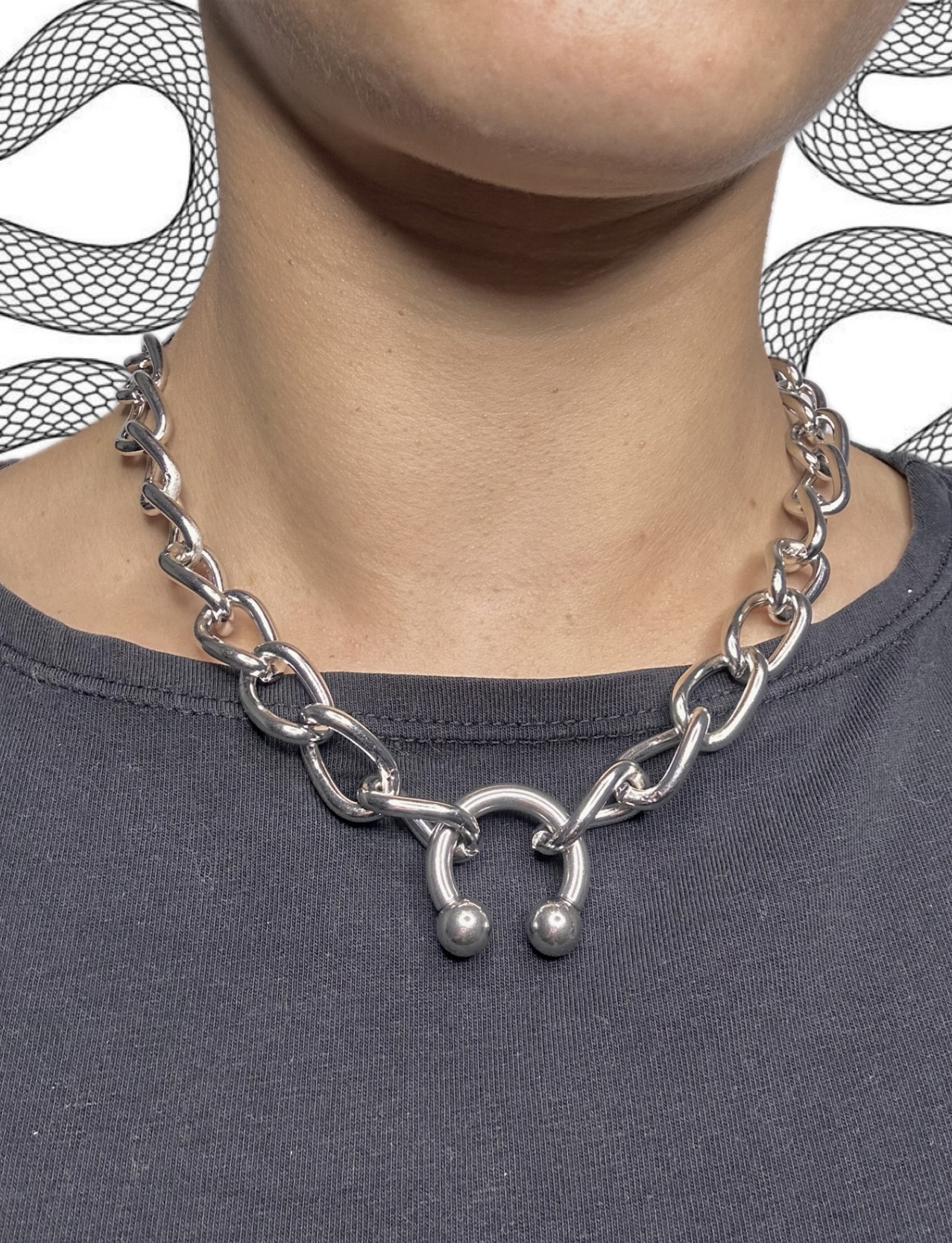 Collar unisex de  acero inoxidable en plateado , con rosca para cierre delantero y cierre tradicional atrás .